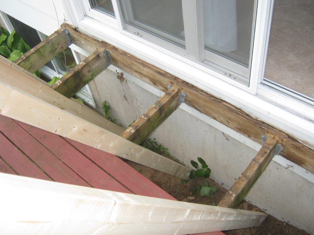 At the time we bought the house in 2011, we knew from the inspection that the deck needed some attention. The ledger board was rotting and attached to the house by rusting away spikes. We simply temporarily support it in order to detach it and replaced the ledger board .